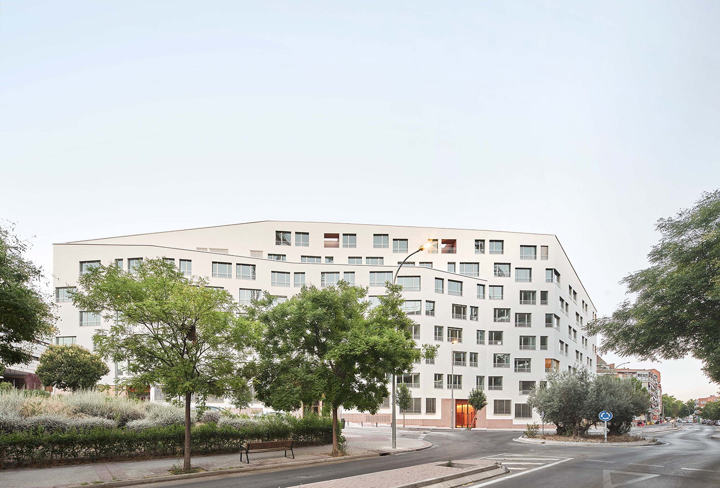 El volumen se pliega para adaptarse a las edificaciones vecinas, integrándose con la topografía y reforzando la conexión urbana peatonal desde la planta baja. La fachada presenta retranqueos, variaciones de altura y huecos unificados que suavizan la escala del conjunto y aportan diversidad creando una percepción más amable.